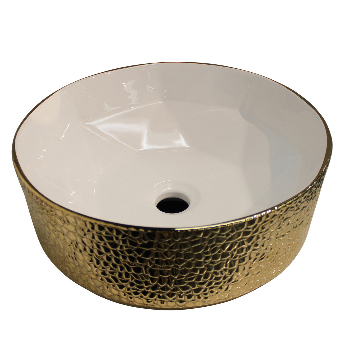 Elevate your bathroom with the Tile Vanity Golden Vessel Sink, a stunning fusion of modern elegance and radiant metallic texture. With its sculpted round silhouette, glossy white interior, and hammered gold exterior, this vessel sink instantly transforms any vanity into a piece of art.