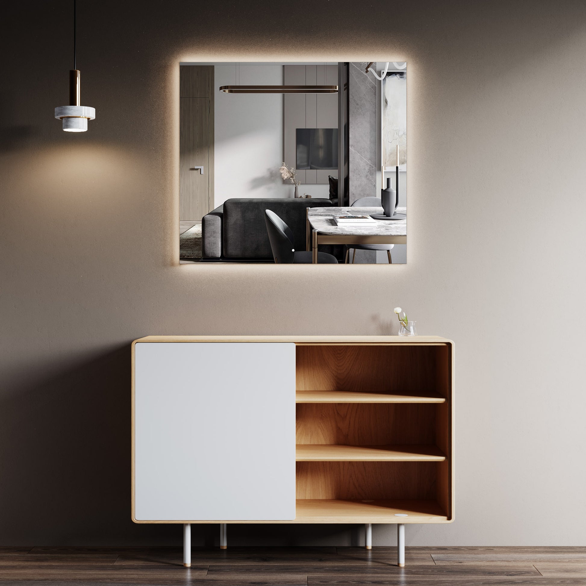 Perfect for grooming, makeup application, and ambient lighting, this larger mirror creates a balanced, luxurious glow while maintaining a sleek, contemporary presence.