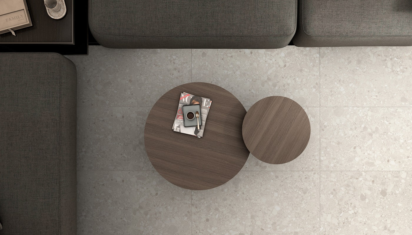 Terrazzo-inspired porcelain with layered stone fragments