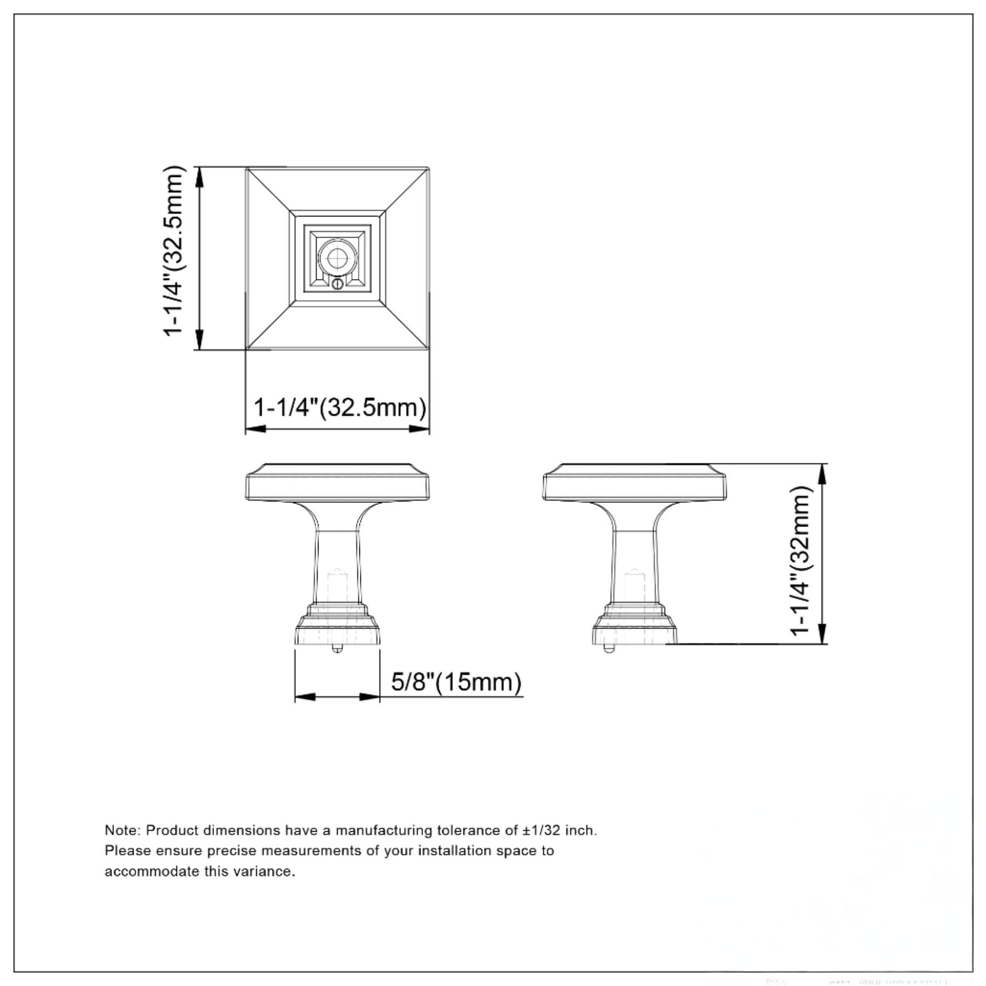 Knob face: 1-1/4″ W × 1-1/4″ H (32.5 mm × 32.5 mm)