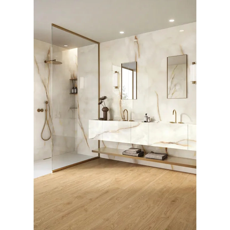 Soft, luminous ivory tones layered with delicate golden veining give Imperium Onyx Ivory a refined, architectural presence. Inspired by natural onyx stone, this porcelain surface captures depth, translucency, and elegance while delivering the durability required for modern interiors. With its polished Lappato sheen and large-format scale, Imperium Onyx Ivory creates seamless, light-filled spaces that feel both sophisticated and timeless — unmistakably So Beautiful.